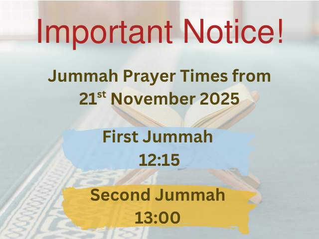 | Jummah | 12:15 | 13:00 | |